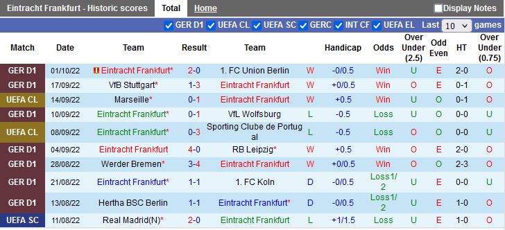 Trái ngược với Tottenham, Frankfurt khởi đầu bằng thất bại 0-3 ngay trên sân nhà trước Sporting Lisbon. Tuy nhiên, với tư cách là đương kim vô địch Europa League, đại diện nước Đức nhanh chóng lấy lại cân bằng khi đánh bại Marseille 1-0 ngay trên đất Pháp. Tiếp đó, họ có 2 chiến thắng quan trọng trước Stuttgart và Union Berlin tại đấu trường Bundesliga. Cả 3 trận, Frankfurt đều mang về lợi nhuận tối đa.