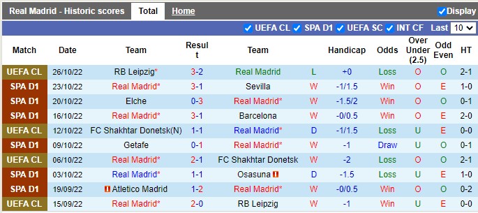Thắng tới 10 sau 11 trận đã đá, ghi 28 bàn và chỉ để thủng lưới 9 bàn, Real Madrid đang độc chiếm ngôi đầu trên bảng tổng sắp với 3 điểm nhiều hơn kình địch Barcelona. Trên sân nhà, Real Madrid cũng thắng 7/9 trận gần nhất tại La Liga (tính cả ở mùa giải năm ngoái) và đặc biệt, đội bóng Hoàng gia Tây Ban Nha đang sở hữu số trận thắng tỷ lệ kèo Châu Á cao nhất giải với 63.64%.