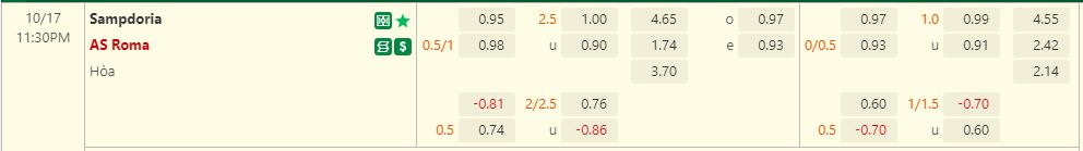 Rạng sáng mai, Sampdoria tiếp đón Roma trên sân nhà. Tỷ lệ kèo châu Á đội khách chấp 3/4 được ấn định thời điểm ban đầu cho thấy dù có lợi thế sân bãi, song Sampdoria hoàn toàn lép vế so với đại diện đến từ thủ đô. Điều này hoàn toàn hợp lý bởi lịch sử chứng kiến sự áp đảo của Roma trước Sampdoria khi họ chỉ 9 lần bại trận và có 19 chiến thắng trong 40 lần đối đầu kể từ năm 2004 đến nay.
