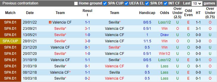 Trong thập niên 2000, Sevilla đụng độ Valencia tổng cộng 49 lần trên tất cả các đấu trường, kết quả, đại diện xứ Andalucia có phần áp đảo với 23 chiến thắng, 19 lần thất bại bên cạnh 8 kết quả hòa. Điểm nhấn mà giới túc cầu yên tâm đặt niềm tin vào Sevilla đó là lợi thế sân bãi khi liên tiếp 4 trận tiếp đón Bầy dơi tại thánh địa Sanchez Pijzuan gần nhất, Sevilla đều ca khúc khải hoàn.